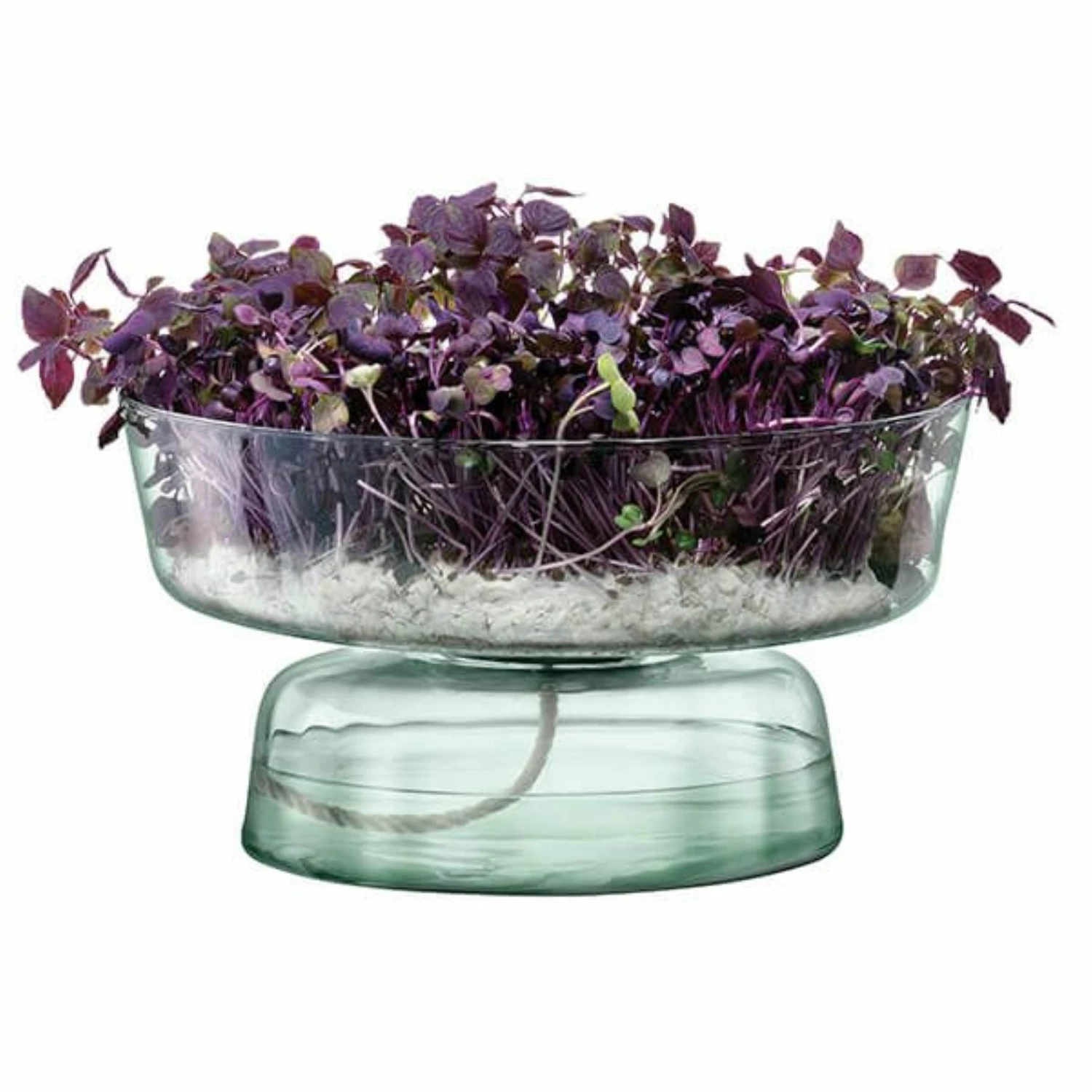 Handmade from re-cycled glass with a part-optic finish the planter has two sections, one for filling with water and one for holding a plant. The included rope sucks up water from below providing the plant with a continuous supply of water.