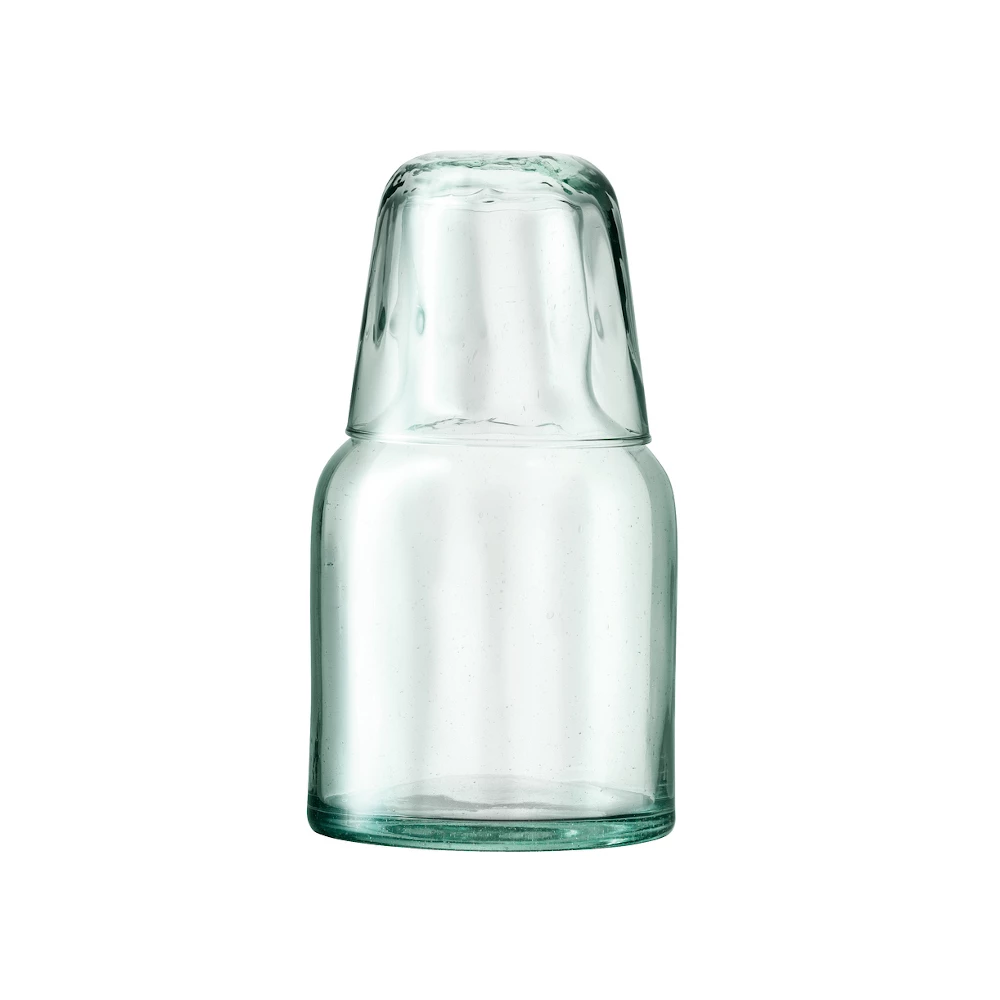 LSA International Mia Carafe & Tumbler Set 0.95L Recycled/Part OpticThe Mia collection is the most environmentally friendly and sustainable glass range around. All the items are individually mouthblown and handmade from 100% recycled bottles so each one is effectively unique. In addition any small bubbles or inclusions are totally natural, and unavoidable, coming, as they do, from the mouth blowers lungs. All are present in a subtly fluted texture with a soft refreshing green tint. Each one is then boxed in recyclable packaging made from recycled card and printed with organic inks.A neat solution to bedtime water! A smallish carafe topped by a water glass acting as a cover, takes little space and is easy to use when half asleep! Look great too when set on a table.Mouthblown Handmade GlassProduced from 100% recycled bottlesAny minor bubbles come straight from the blowers lungs!Handwash in warm soapy waterCapacity 950ml / 32ozFluted texture with green tintGift box in recyclable recycled card printed with organic inks H20.5xL10.5xD10.5 cms
