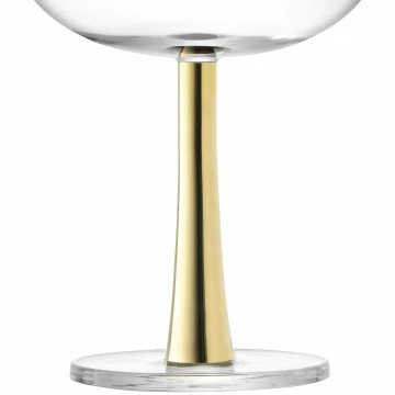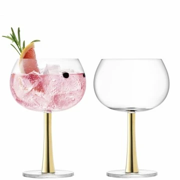 A pair of gin balloon glasses by LSA International with subtly flared, handpainted stems in gold. The goblet has a wide flattened bowl to enhance the aroma of the spirit’s delicate botanicals.