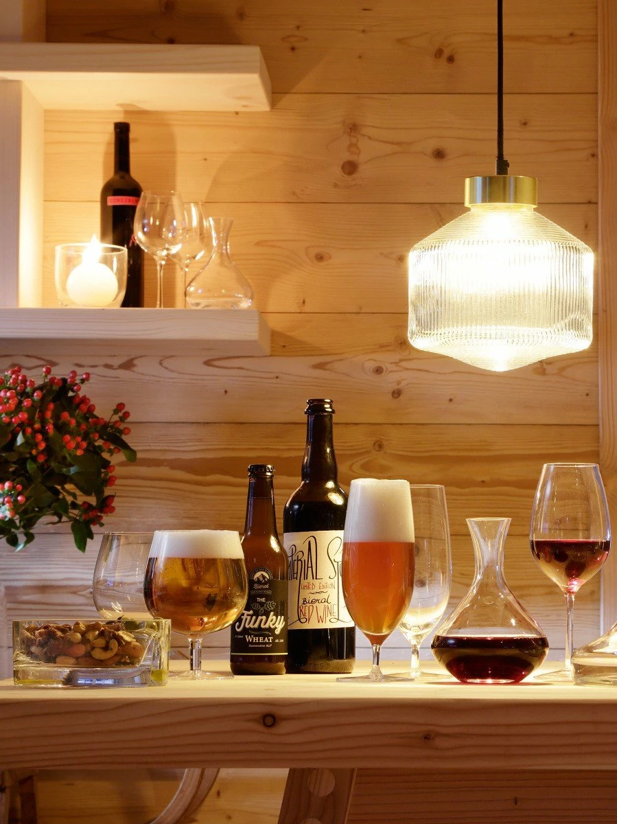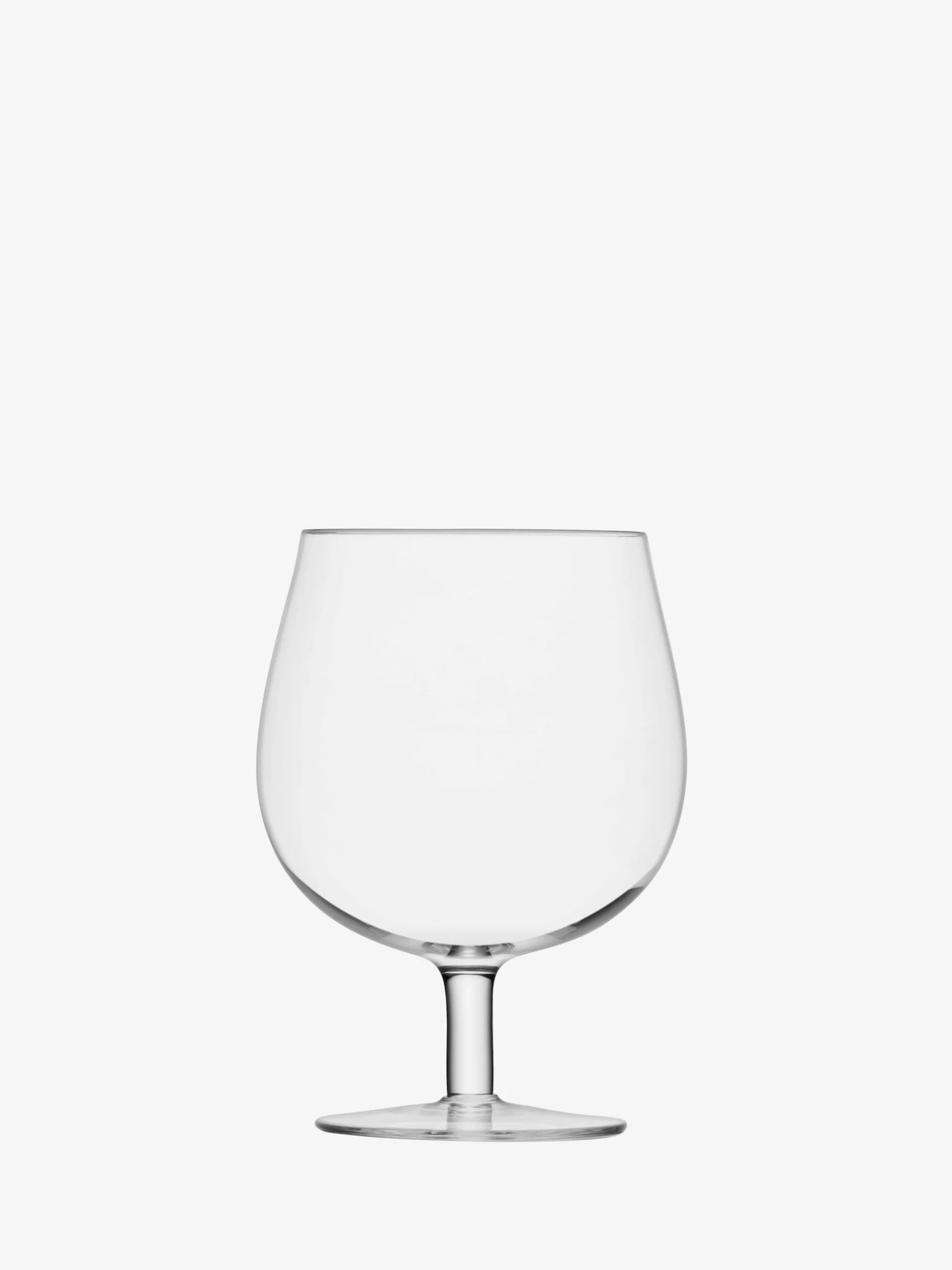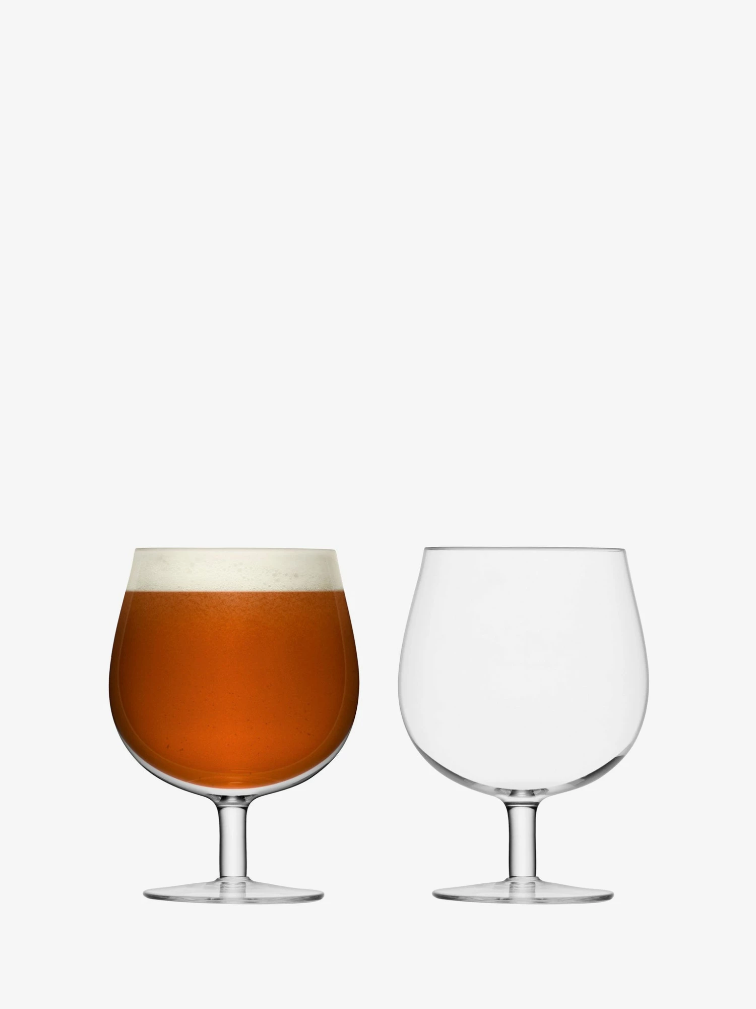 Mouth-blown beer glasses with rounded bowls and short stems. Set of two stemmed beer glasses, mouth blown by skilled glassblowers with generously proportioned bowls. For craft beers and small bottles. Mouth-blown glass. Short, thick stems. Generous bowls. Dimensions: Capacity: 550ml, Height: 14.5cm, Width: 8.5cm. Due to their handmade nature, the size of these items may vary slightly. Style code: BR33. Materials & making: The Bar craft beer glass is mouth blown by skilled glassblowers to create the classic stemmed shape. The stem is drawn by hand from the bowl and the foot is shaped using a wooden tool and applied by hand. The rim is fire-polished to achieve a smooth finish.