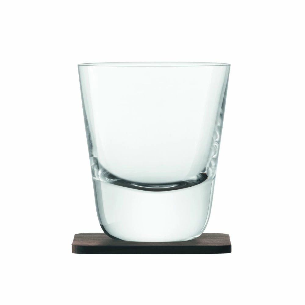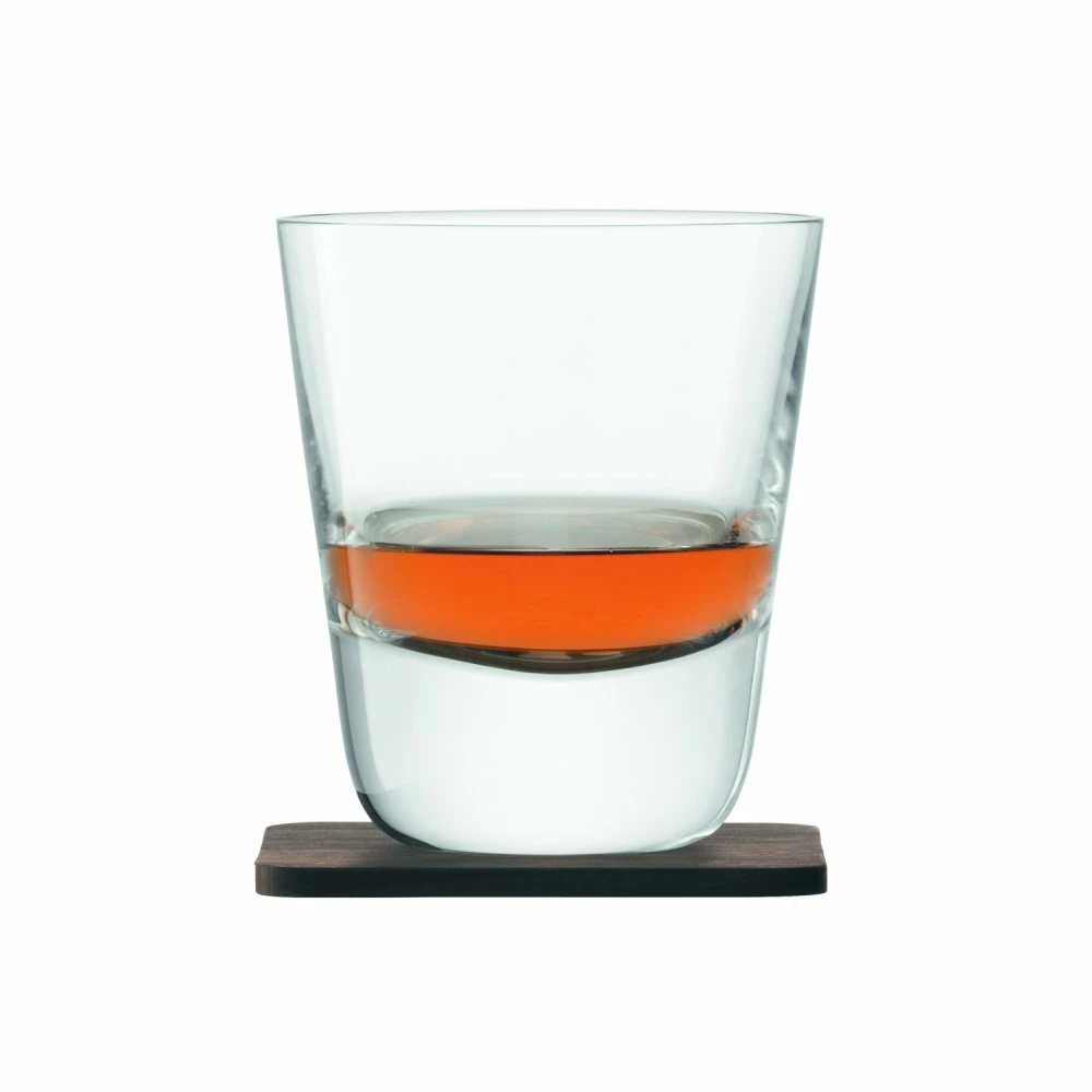 A set of 2 LSA Whisky Tumblers with a conical shape and a heavy rounded base paired with solid FSC-certified walnut coasters.