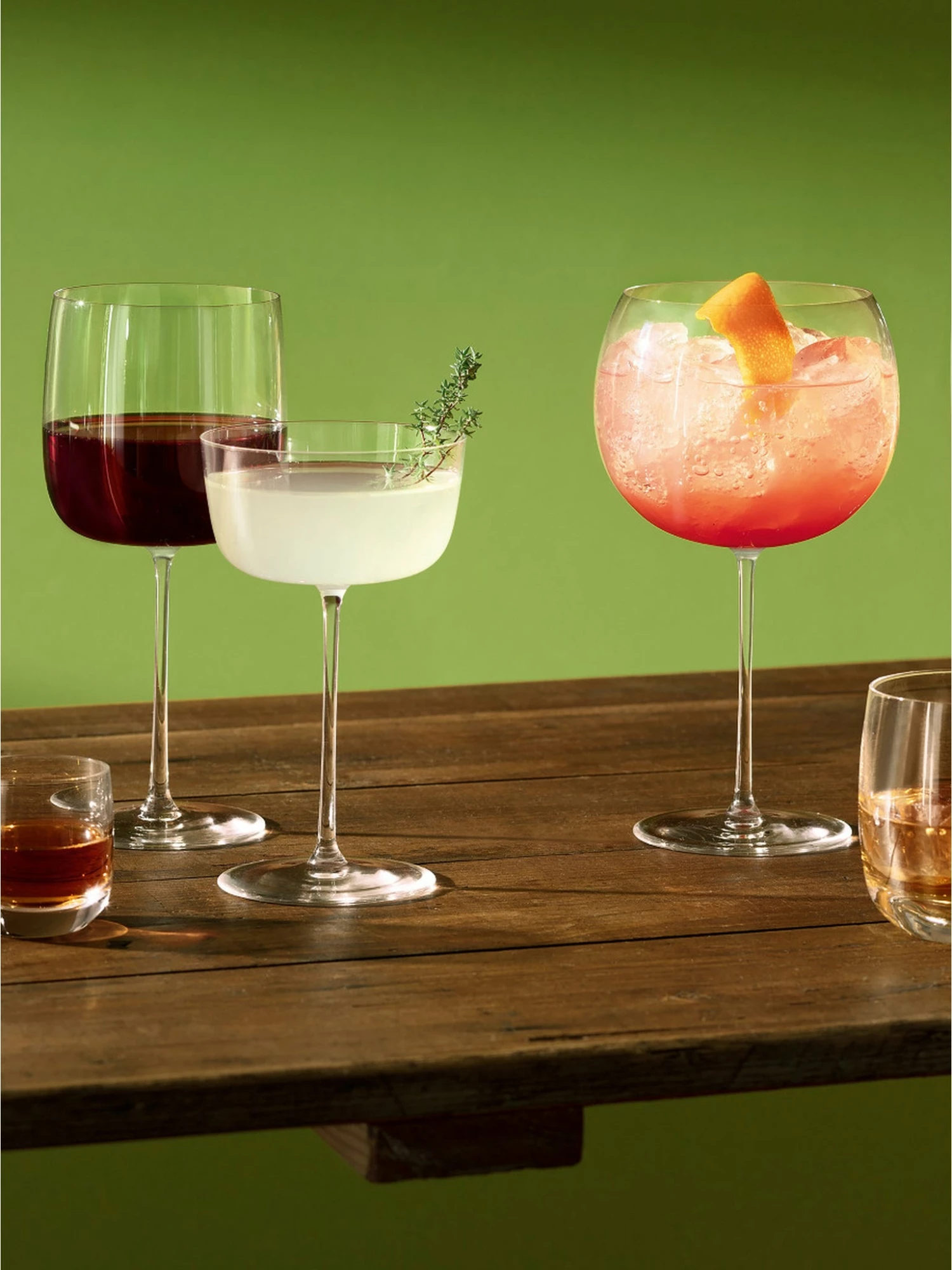 Set of four cocktail saucers with wide, flared bowls and fine straight stems. Designed for martini cocktails or champagne. Made from lead-free crystalline glass for clarity and strength. Flat-based bowls. Fine stems. Flat feet. Dishwasher-safe glass. Dimensions: Capacity: 240ml, Height: 15.5cm Width: 9.5cm. Style code: BG07. Materials & making: Design and technology combine to complement and simulate handmade processes resulting in stemware featuring cold-cut and fire-polished rims, with finely drawn stems, produced from environmentally friendly lead-free crystalline glass. The quality of the glass guarantees a high level of flex and durability, brilliance and clarity.
