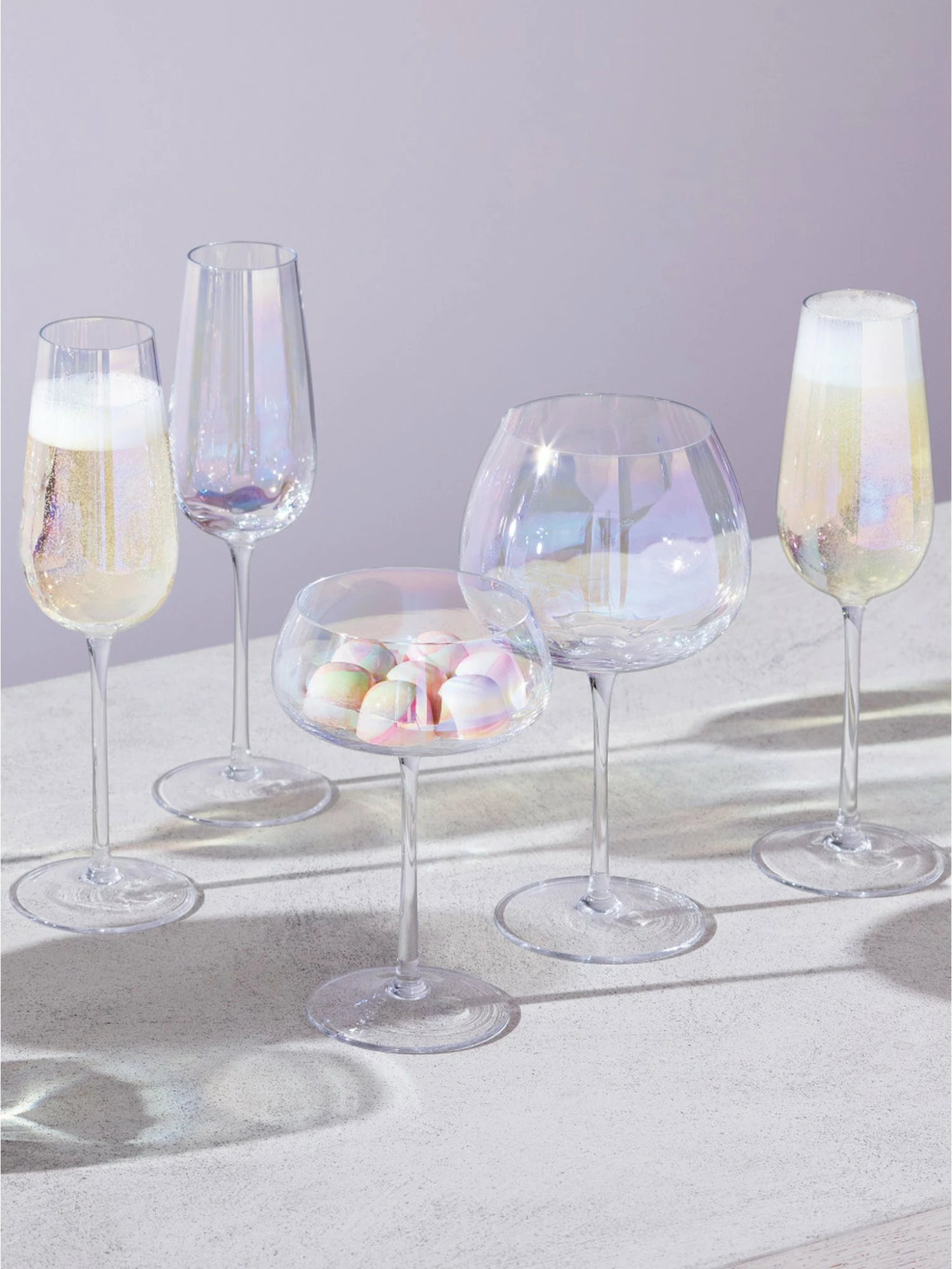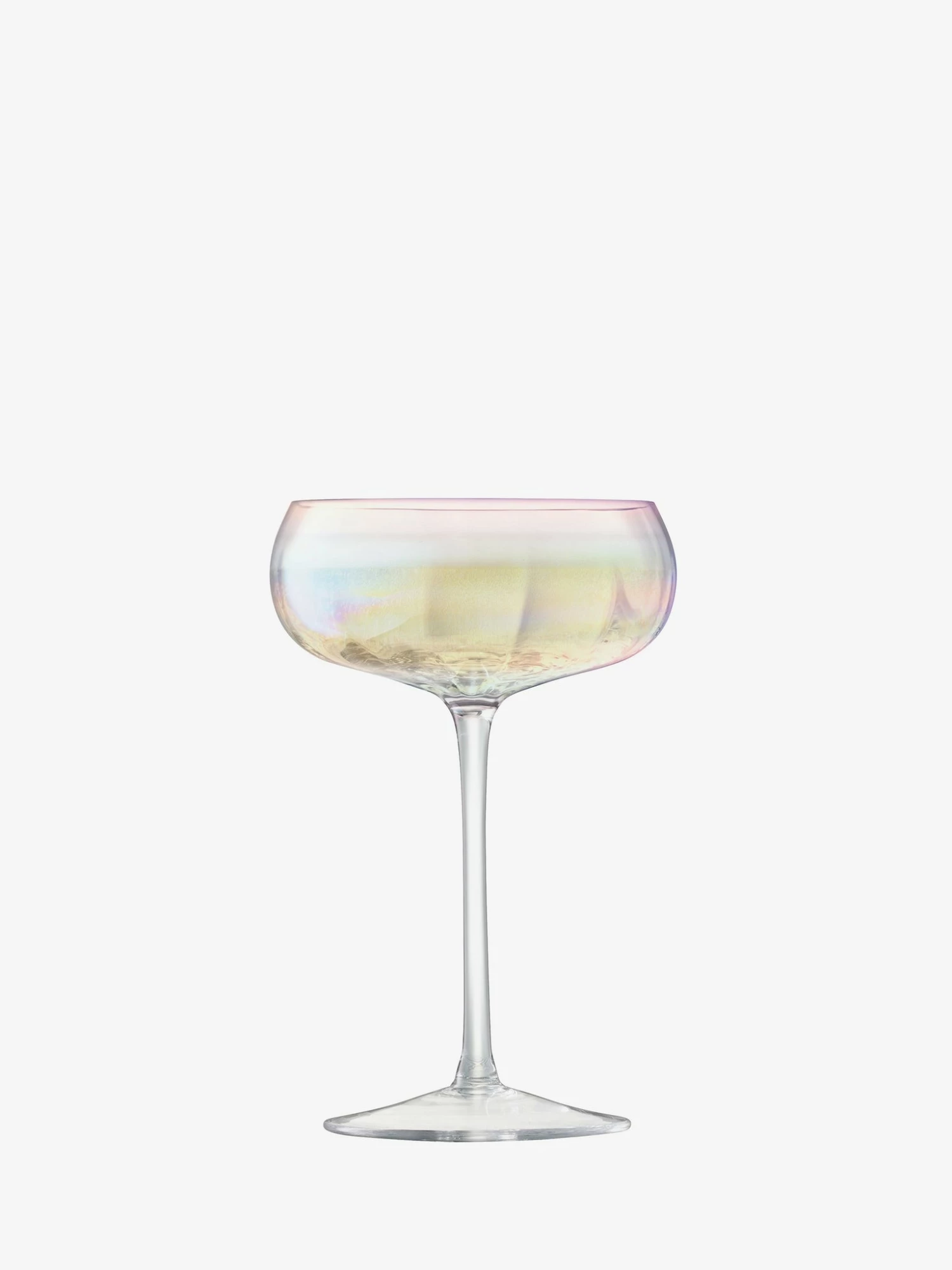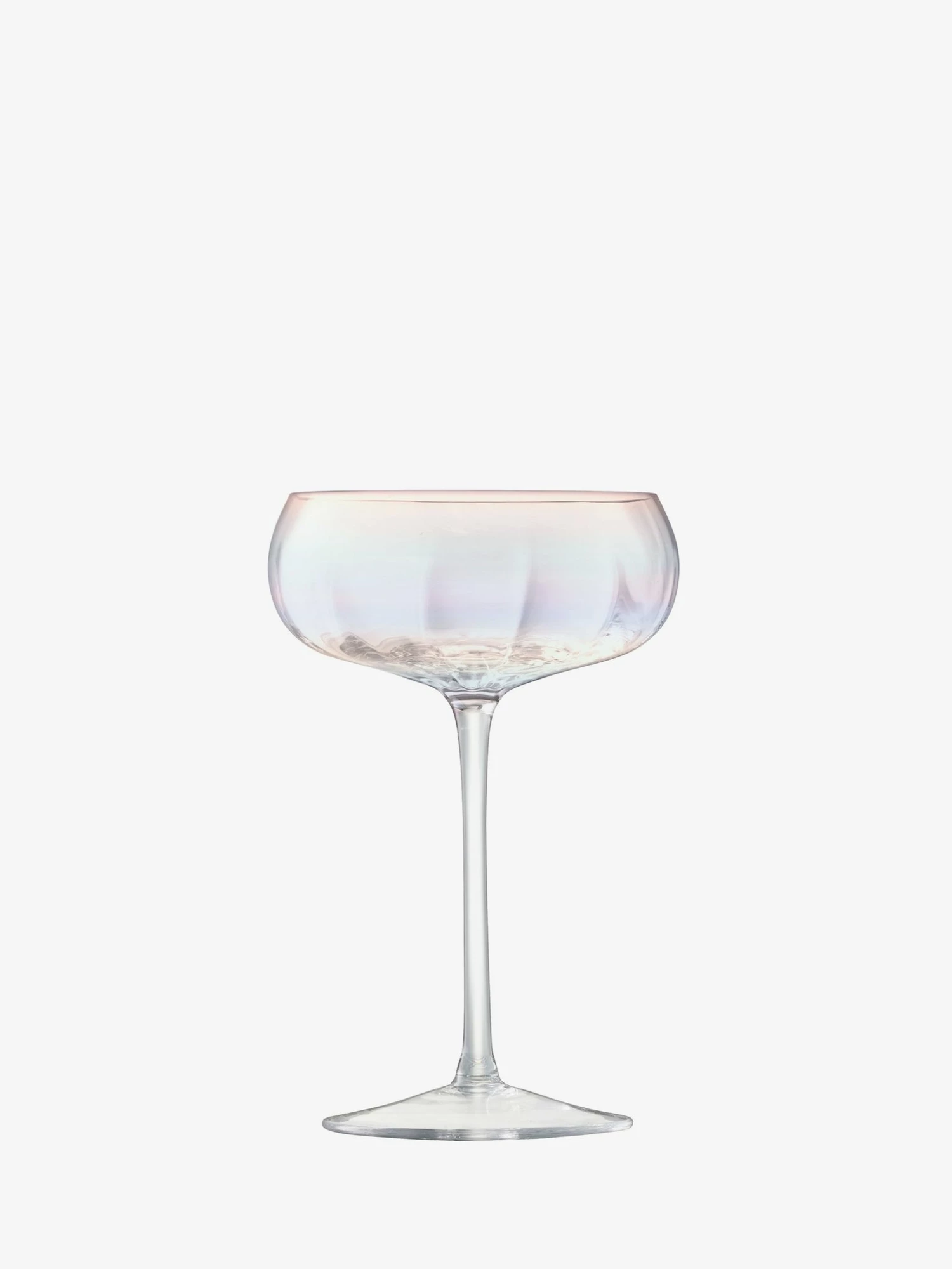 A set of four mouth-blown coupes hand painted with iridescent lustre. The bowls have a subtly-fluted texture which fades towards the rim. Mouth-blown glass. Subtly-fluted texture at base of bowl. Bowls hand painted with pearlescent lustre. Hand-drawn stems. Dimensions: Capacity: 300ml, Height: 16cm, Width: 10.5cm. Due to their handmade nature, the size of these items may vary slightly. Style code: PE05. Materials & making: Mouth blown by skilled glassblowers to create a champagne saucer with subtly-fluted texture. The stem is drawn from the bowl while the glass is still malleable and a foot is applied by hand using wooden tools. Hand painted with an iridescent lustre and fired to achieve the pearlescent finish.
